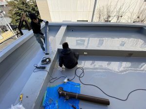 改修ドレン設置後防水塗料を塗布します。